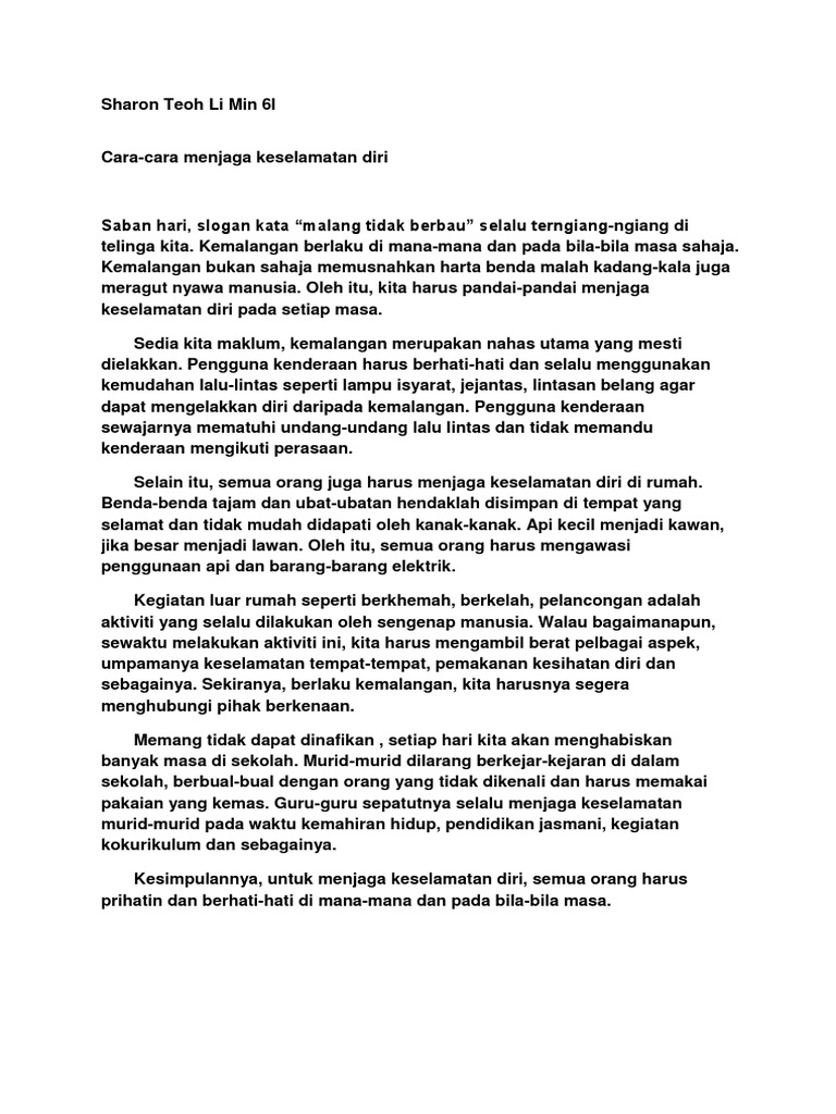 Koleksi contoh karangan dan latihan bahasa melayu cikgu mohd fadli. Cara-cara Menjaga Keselamatan Diri di Sekolah elakkan berlari bertolak-tolakan bergaduh tidak bermain Isi 1 barangan yang boleh Di dalam bilik darjah membahayakan diri. Tanah kotoran debu atau bahkan daun jatuh yang melekat di sepatu siswa dapat membuat lantai sekolahmu kotor.
